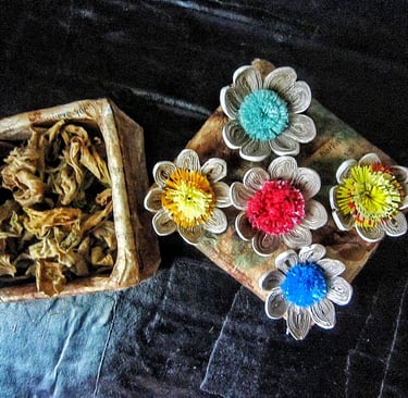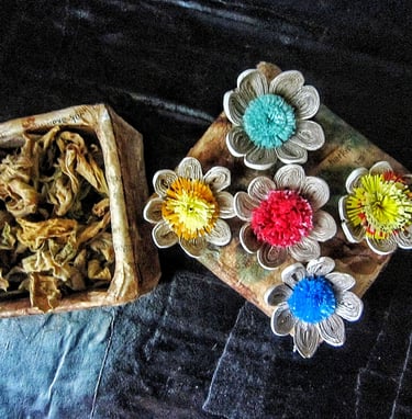 Any kind of recycled plastic we used like recycled plastic bag,cooking oil cover plastic and many more.So that,the center of the flower very cheerful.This pretty quilling flower available for five color flower center you can choice like red center flower,green center flower,yellow center flower,blue center flower,mix center flower.For more special for you,this flower come for one set is 10 pieces of floral for more of your creation.Make beautiful blossom of your stuff with this eco friendly quilling flower and will be your style.
