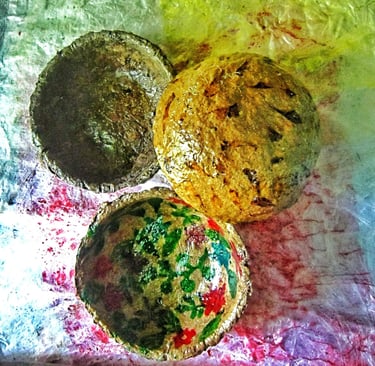 Recycled paper decorative bowl.Beautiful random one set paper bowl will be very beautiful for your storage and room decor.This bowl base made from recycled pulp paper from recycled cardboard.Which make it different is the color and decorative of the bowl.Colored bowl like flower stamp bowl,,black bowl colored from natural black tea and the last decorative bowl with marigold dry flower.Special for you,this bowl will come for one set three pieces for random color.
