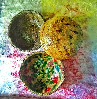 This decorative bowl,we create with sustainable material and sustainable process.Stamp bowl made from food color for stamping,black bowl made from a combination of pulp paper and black tea,and stick of dry marigold flower on the bowl,we just use the original color and without additional chemical color.We must be sure of our product waste,if must throw away it is not dangerous with environment.Make your peaceful storage at once cheery home decor with sustainable random color recycled bowl.